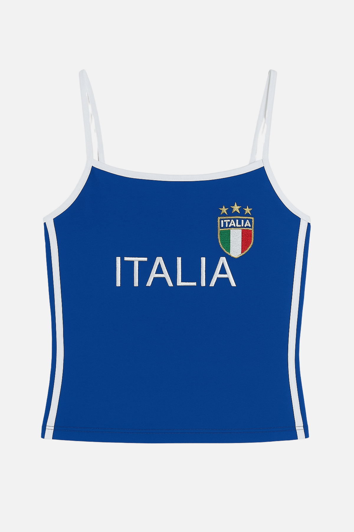• Design: Blue cropped tank top with Y2K-style lettering