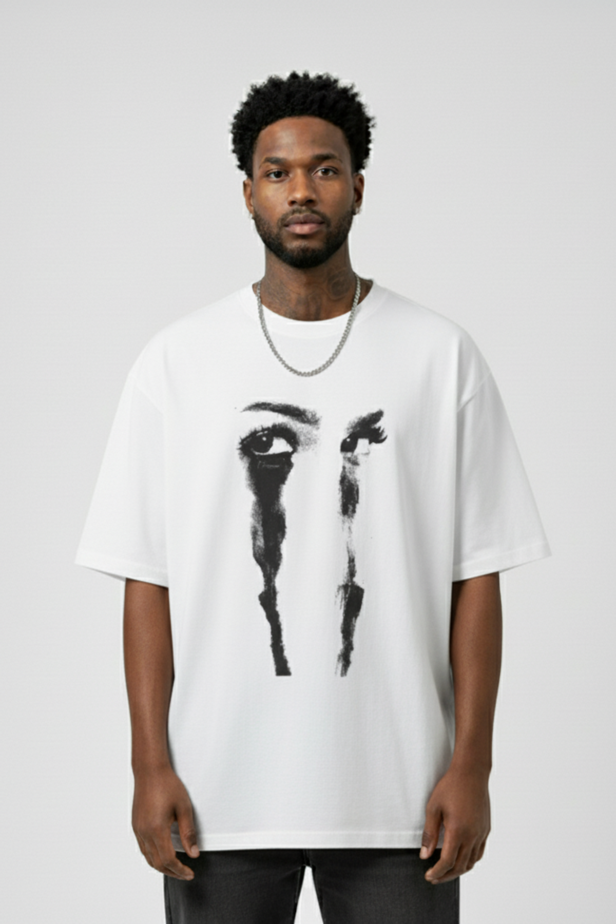 Crafted from a premium cotton-polyester blend, this oversized graphic t-shirt ensures softness, durability, and lasting comfort. The relaxed silhouette with dropped shoulders delivers effortless streetwear edge, while the monochrome crying eyes design makes it easy to pair with jeans, cargos, or layered fits. Whether styled solo or under a jacket, this white oversized tee guarantees a standout look.