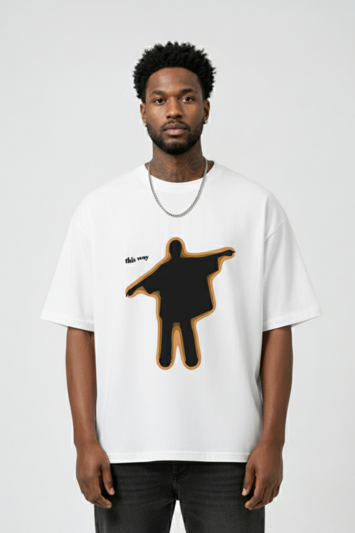 Men’s oversized white t-shirt with silhouette-inspired graphic design